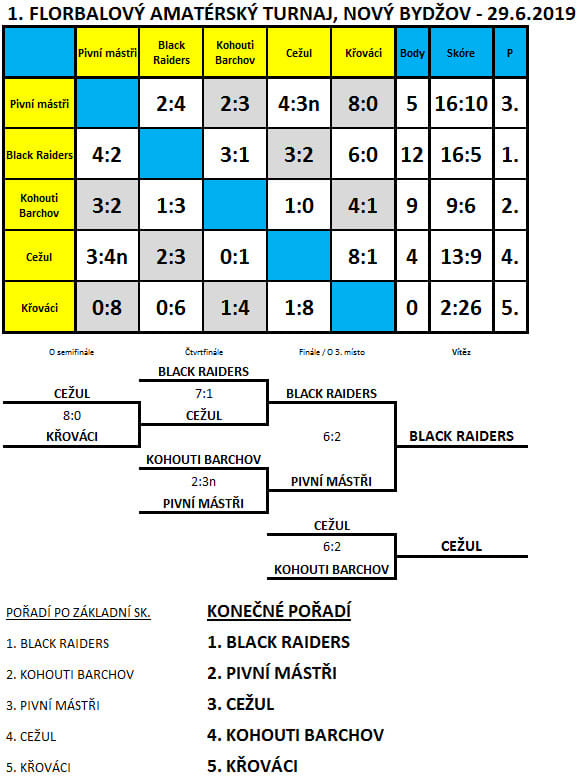Turnaje se zúčastnilo 5 týmů: Black Raiders, Pivní mástři, Cežul, Kouhouti Barchov, Křováci.